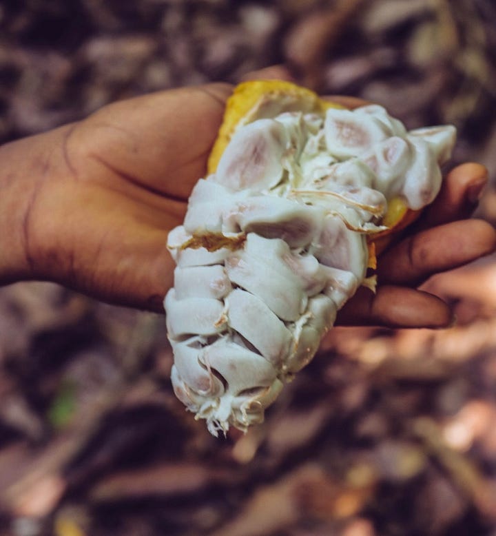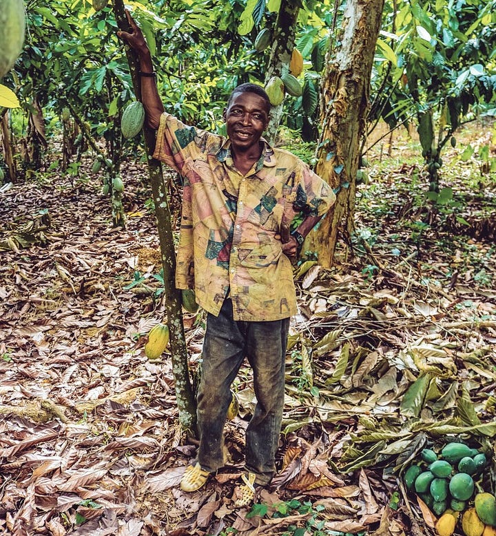 “It’s hard work,” said Cocoa Jean, driving his machete into the ground between our feet. His sweat-stained shirt hung almost to his knees. After dabbing his forehead, he picked up one of the cocoa fruits from a pile beside him and cracked it sharply against a tree trunk. With practiced ease, he split open the yellow shell and revealed a white, slimy string of beans. I was invited to taste one. The pleasing sweetness of the pulp was swiftly overridden by the sharp bitterness of the beans. Jean grinned and shook his head gently.